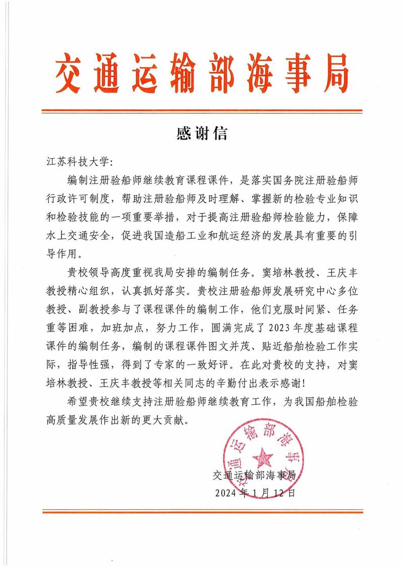 2024年新年伊始,交通运输部海事局致信嘟嘟成人网 ,感谢学校依托注册验船师发展研究中心,圆满完成2023年度注册验船师继续教育课程课件编制工作,有力支持了船舶检验高质量发展。