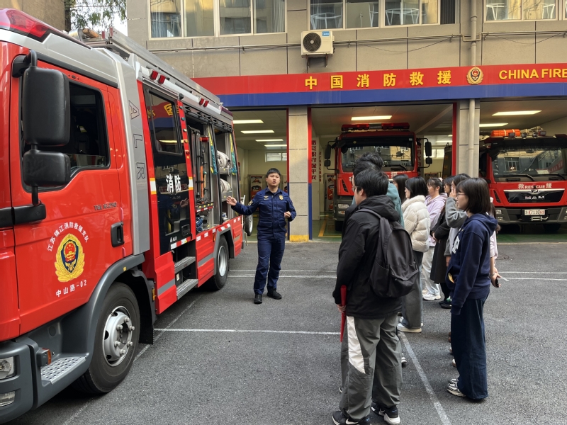 活动伊始,支部成员来到校园指定场地,近距离参观消防车。消防员详细介绍了消防车的核心功能模块,包括水罐储水系统、高压水枪操作原理、破拆工具使用场景等。针对船海专业特色,消防员特别讲解了船舶火灾与陆地火灾的差异,以及消防车在港口、码头等特殊场景下的应急救援策略。