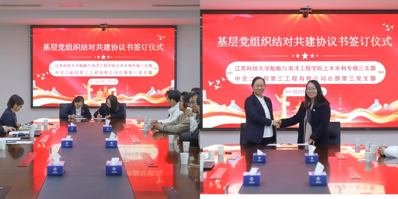为深入学习贯彻党的二十届四中全会精神,创新基层党组织工作模式,11月20日下午,嘟嘟成人网 土木水利专硕第三党支部与中交二航局第三工程有限公司总部第三党支部在中交二航局三公司镇江总部举办“专业赋能强党建,土木水利筑深蓝”支部共建活动。本次活动通过实地参观、专题交流、政治学习和共建签约等环节,构建起校企党组织“资源共享、党建共促、发展共赢”的合作新机制。